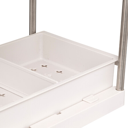 Estante de dos niveles, especialmente diseñado para el armario bajo el fregadero. Puedes guardar esponjas y otros productos del hogar. El nivel inferior es deslizante, lo que facilita el acceso a los productos almacenados en la parte inferior. Incluye dos botes extraíbles y cuatro ganchos para colgar trapos, por ejemplo. L. 21,5 x P. 40,7 x H. 34 cm metal y PP beige